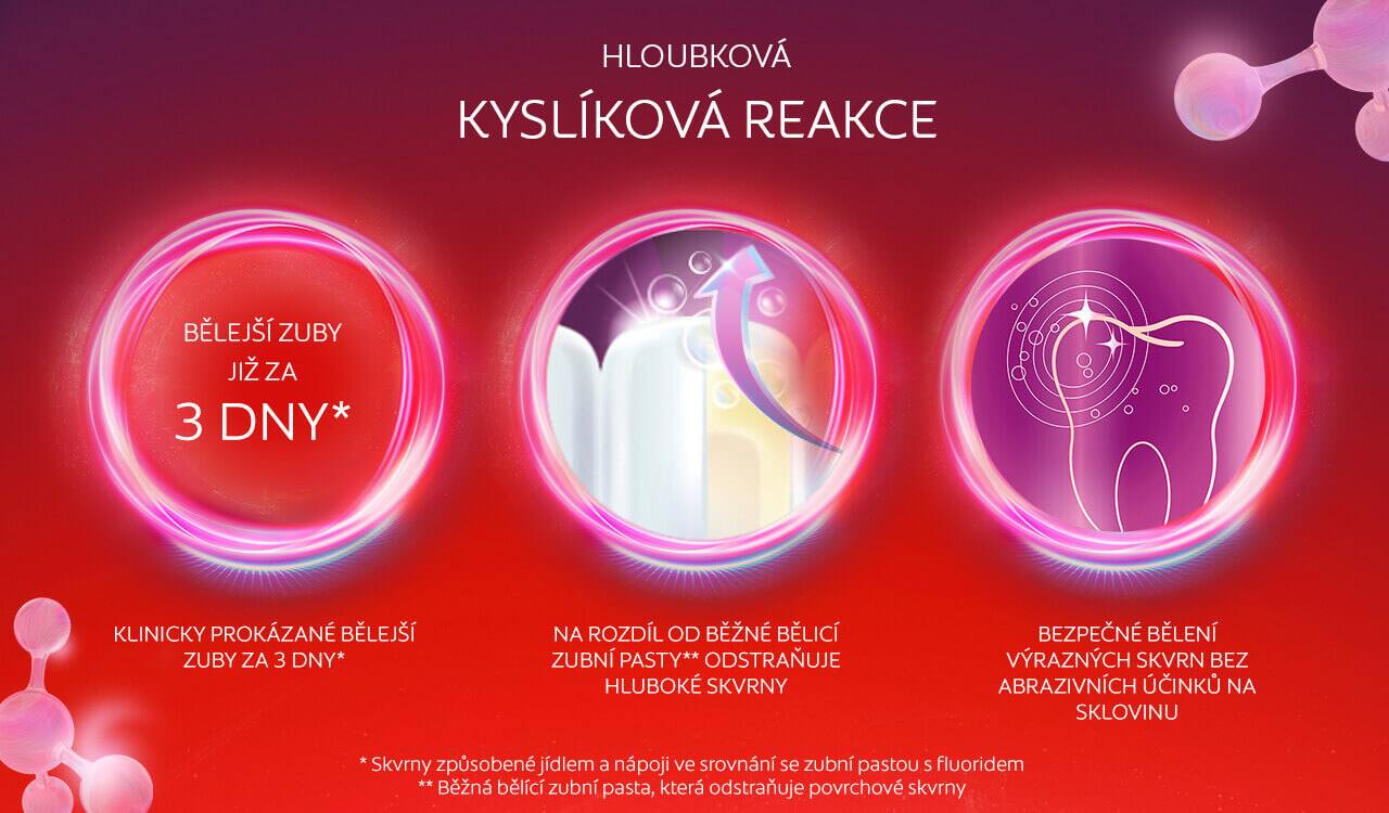 Na rozdíl od běžné bělicí zubní pasty, která odstraňuje povrchové skvrny, obsahuje naše složení miliony volných molekul kyslíku, které se při čištění aktivují v ústech. Tyto molekuly chytře detekují a odstraňují skvrny, aby byly zuby bělejší za 3 dny.*